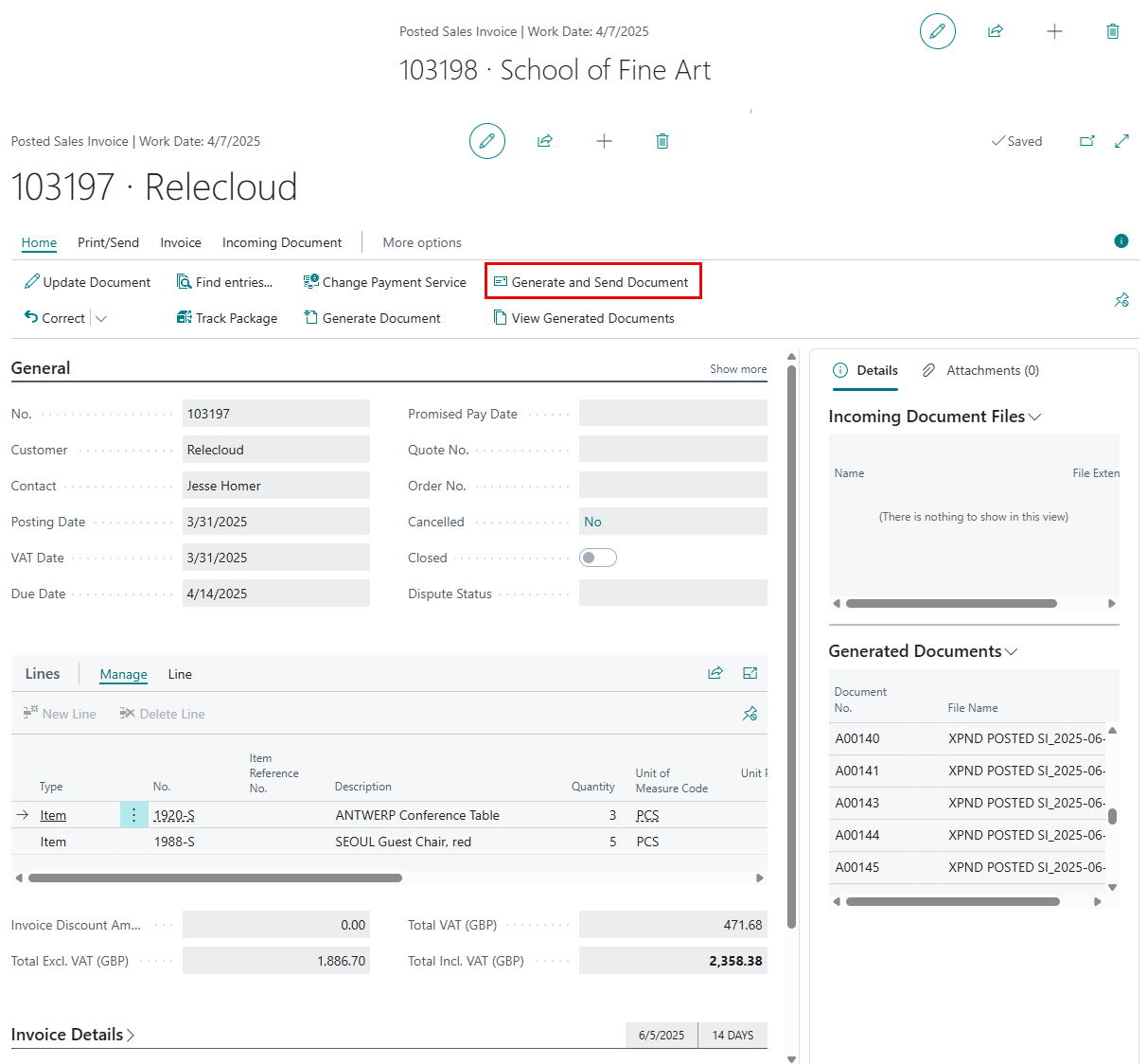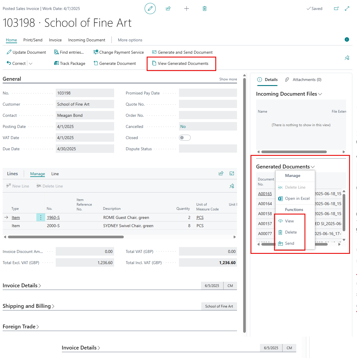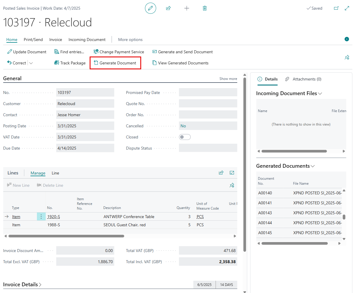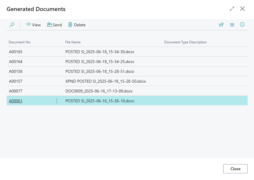 - You can perform various actions with the generated documents, either from the Generated Documents FactBox or Generated Documents window:
