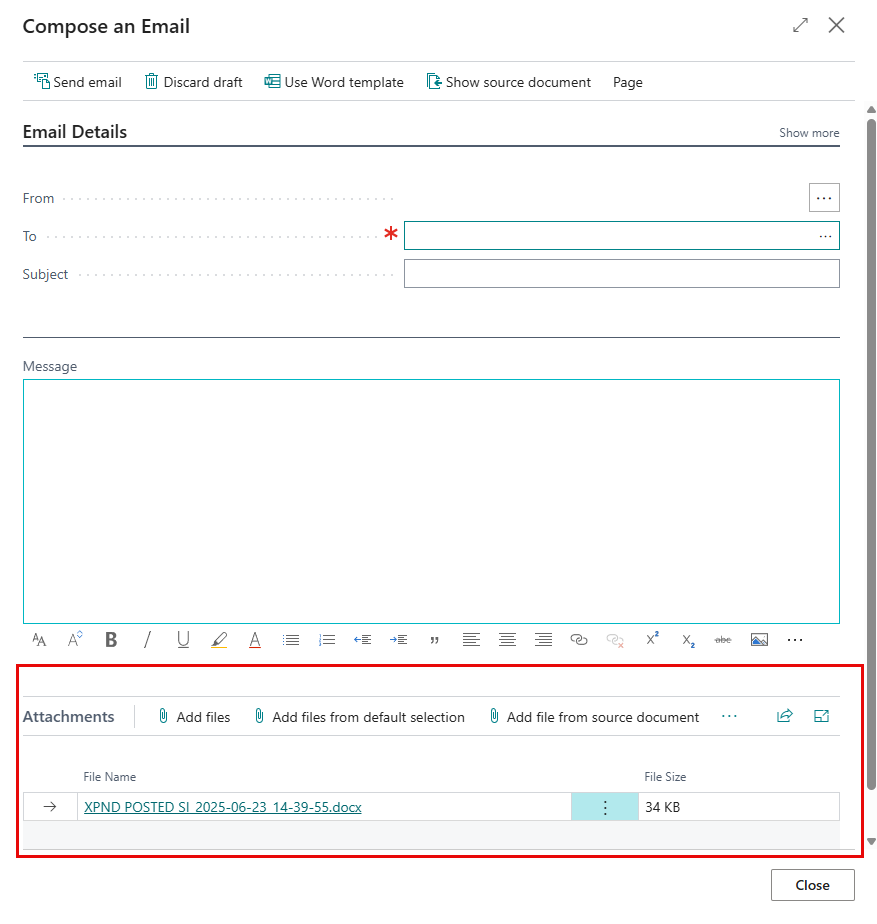 - In the standard Compose an Email window where the documents that have just been generated are already attached, fill in the recipient, subject, and email body, and then choose Send email.
