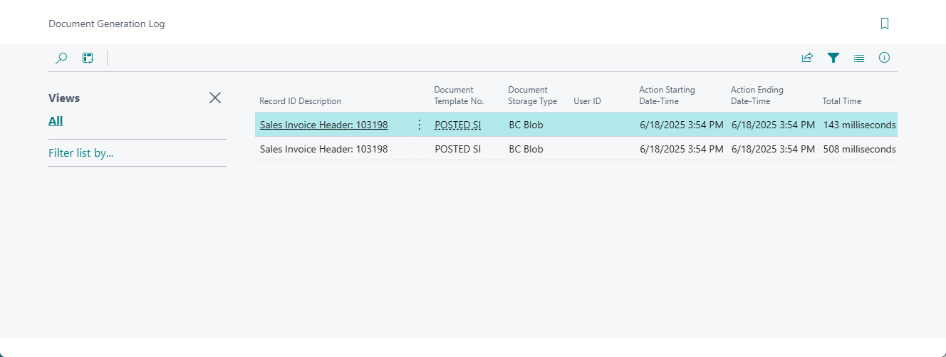 Whenever a document is generated from a template, an entry is created in the document generation log on condition that the document generation log is enabled in the Flexible Documents Setup. You can view the log for a specific document template or access a complete log covering all templates. This feature is especially useful for tracking activity, analyzing usage patterns, and identifying the cause of any issues related to document generation.