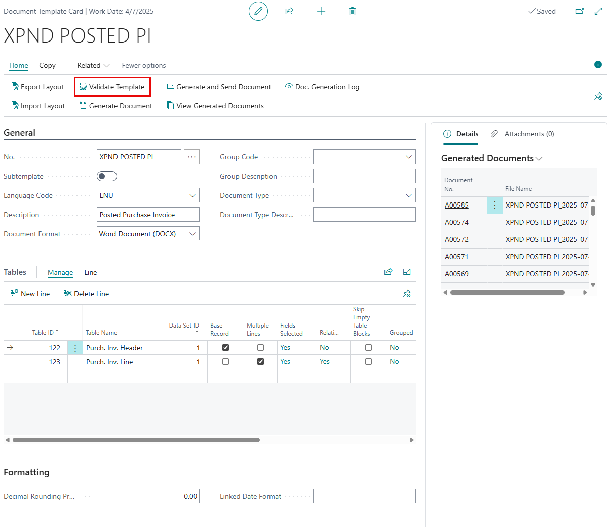 - The source data setup on the document template has incorrect or partially correct setup. Resolving such issues will ensure the Business Central data is retrieved properly on generated documents and there are no performance issues.