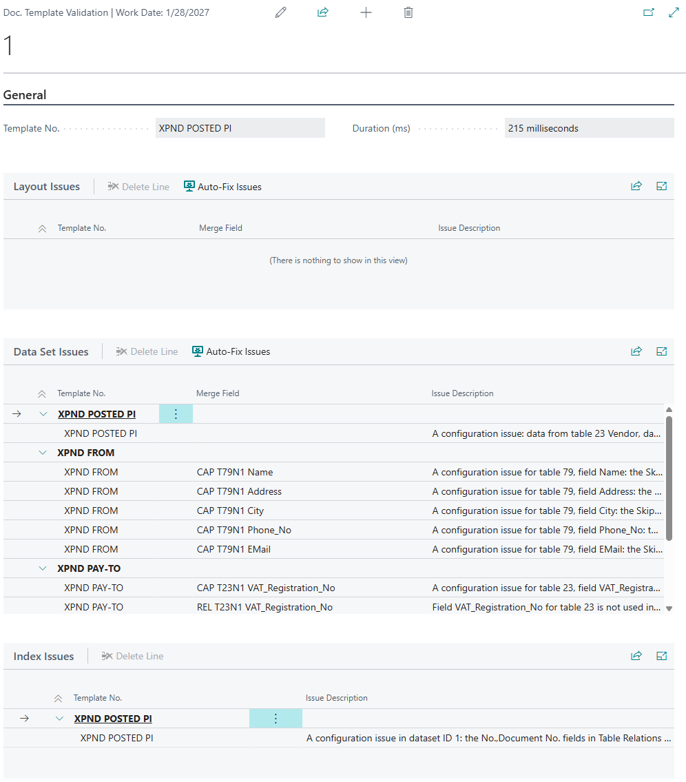 - (optionally) You can use the Auto-Fix Issues action to automatically resolve issues where possible. Issues that could not be resolved automatically will need to be reviewed manually by correcting the template configuration (either on the template card or in the document layout or both depending on the issue).