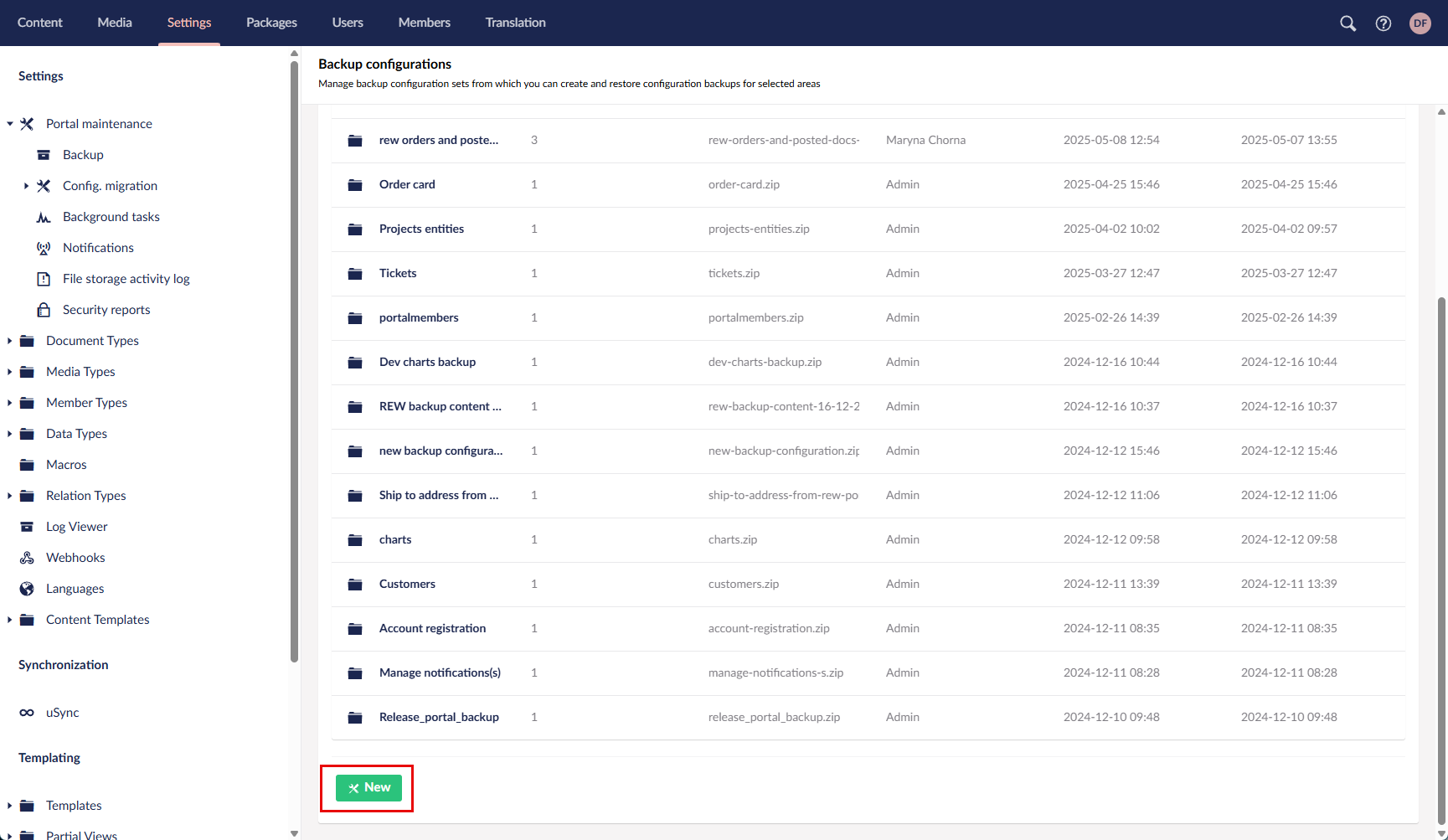 To be able to back up or restore the portal back end, you must create at least one backup configuration where you specify which backoffice areas will be exported/imported during backup/restoration and how merging will be handled during restoration.