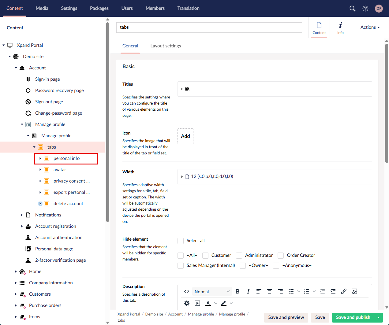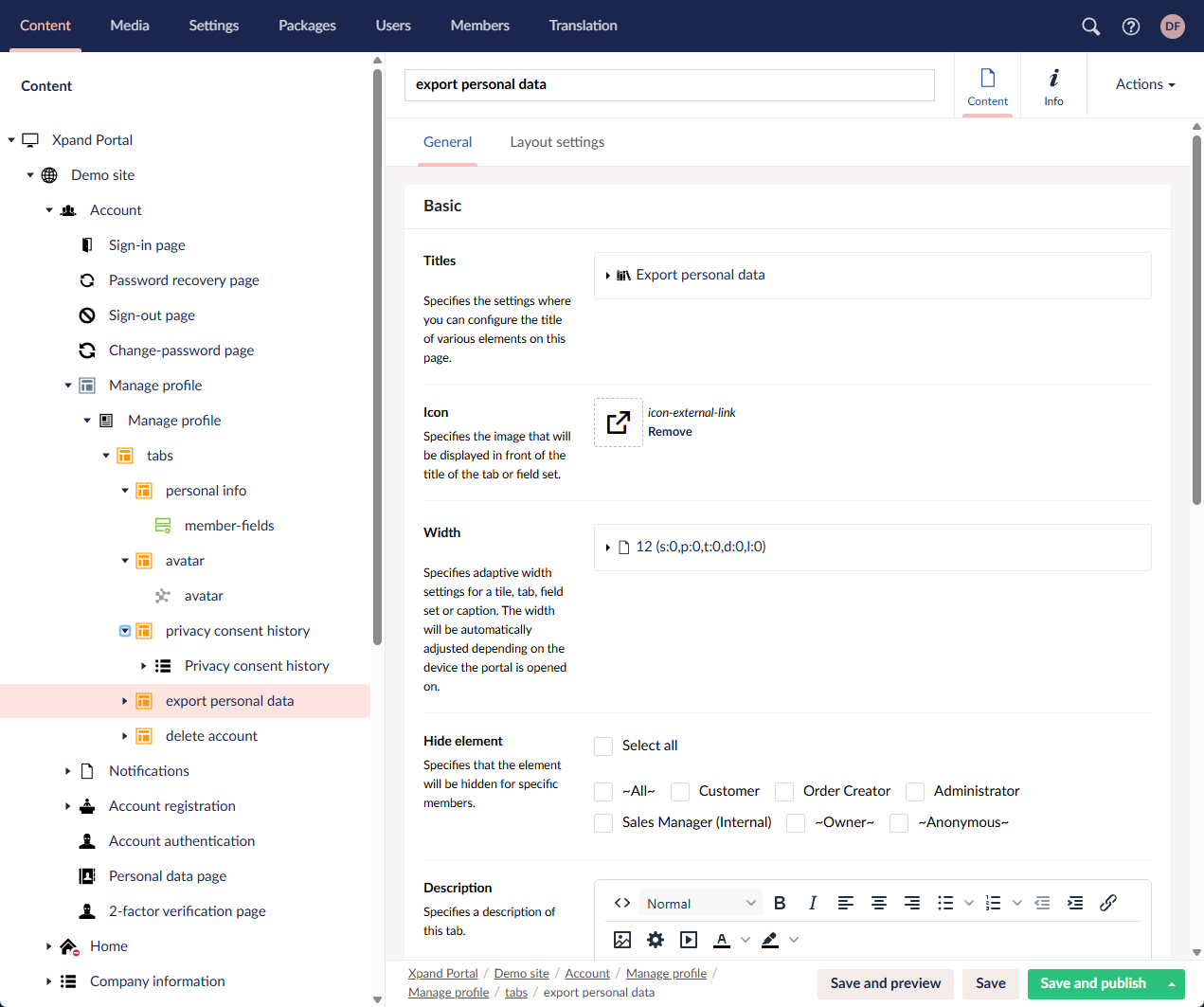 Member personal data page. - On the General tab, in the Description field, you can enter text that will be displayed on the Export personal data tab of the Manage account page. For example: "Select the 'Export my data' action to retrieve the data that the portal stores about you."