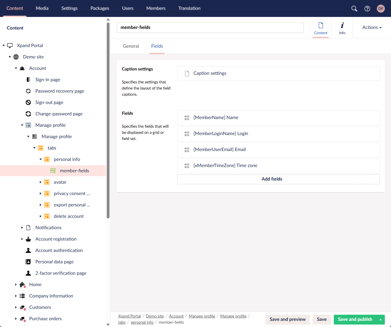 Extended field set. This field set will host additional fields with personal information. - Configure the extended field set, and then save and publish the changes. Recommended fields: