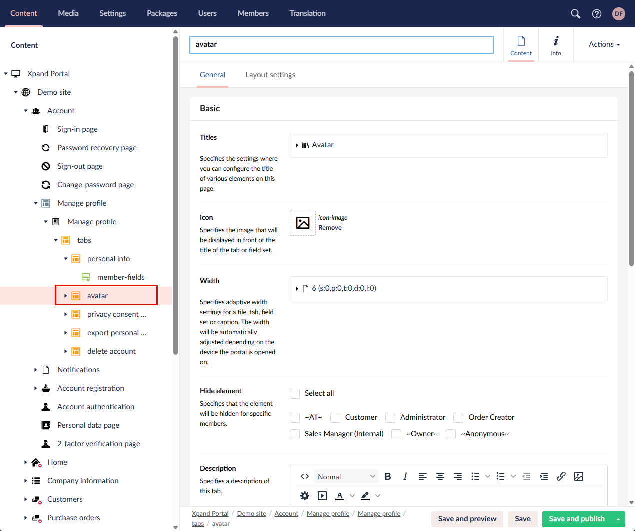 - Hide element - This setting hides the layout block from the home or detail page. It can be configured per member group. In the layout block page settings, on the General tab, in the Hide element setting, select one or several member groups, for which this layout block will be hidden. Alternatively, you can select the ~All~ check box to hide it for all member groups (without the necessity to select every member group's check box) or select the Hide element check box to have all member groups selected at once.