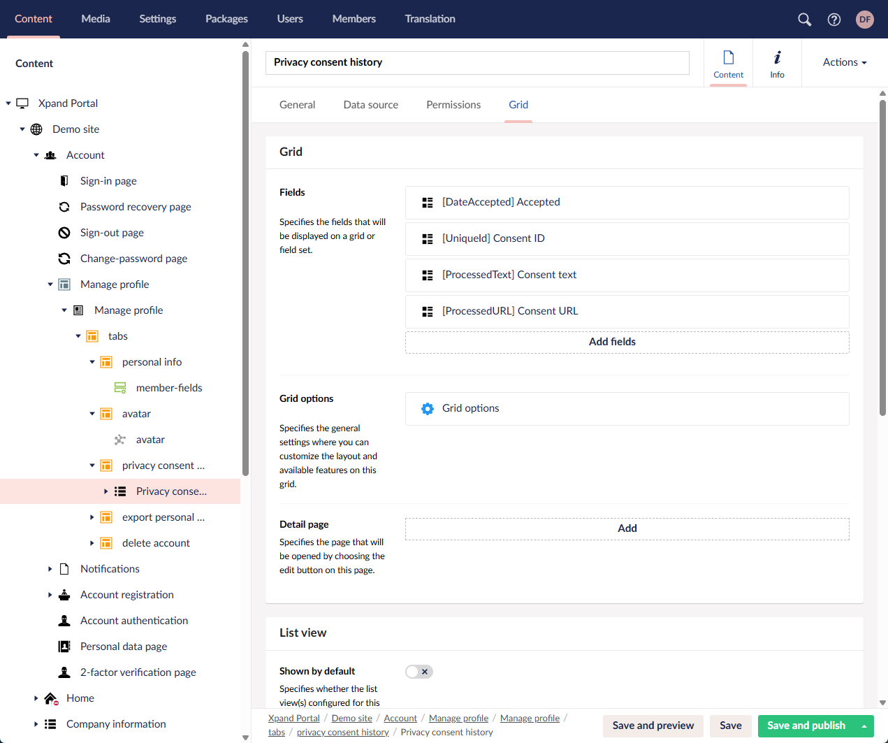 Grid page. The page will host the privacy consent history data. - Configure the grid page, and then save and publish the changes. Note the following: