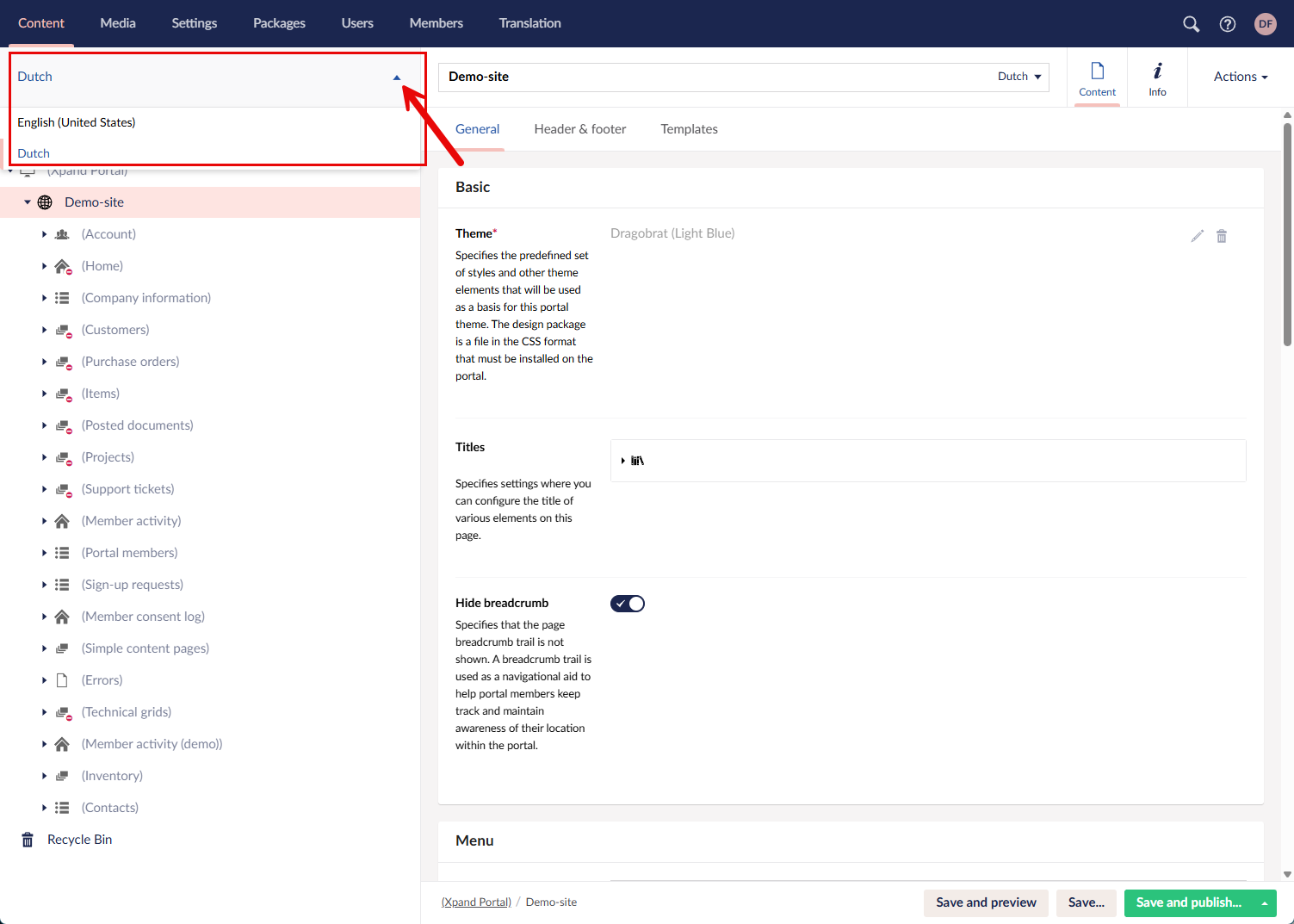 When you have more than one language on your portal, the content for each language is configured separately. You can switch between languages in the top left corner of the Content area.