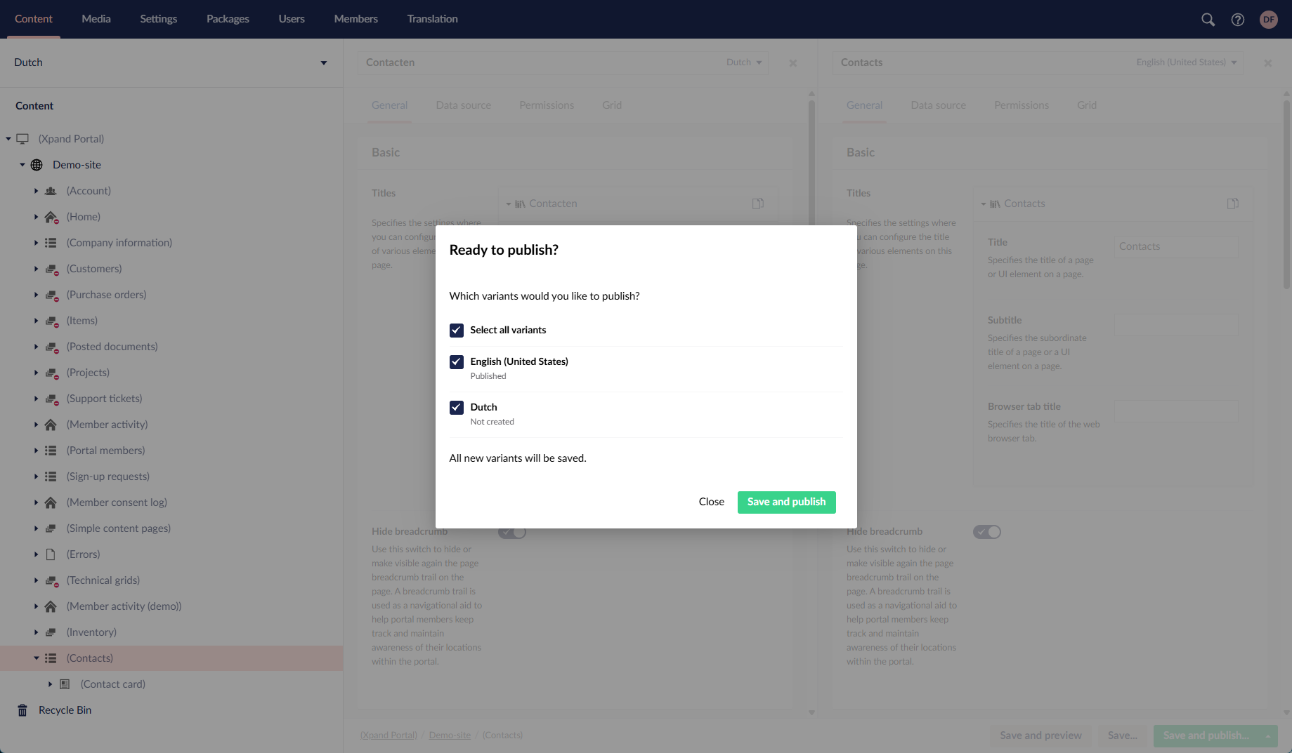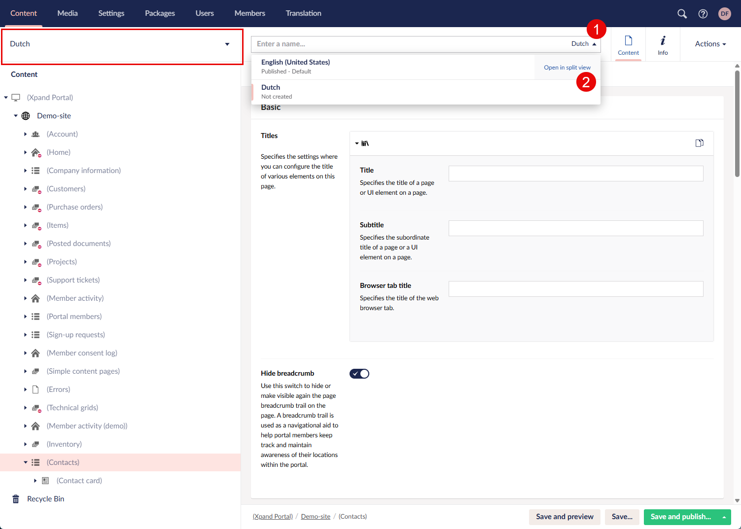 - Once you are done configuring and localizing a page or page element, select Save to save or Save and publish to save and immediately publish the changes. When you have multiple languages, during saving (or saving + publishing), you need to select the language(s) to save (or save and publish) the changes for. If you are not in the split view, only the currently selected language is available for selection.