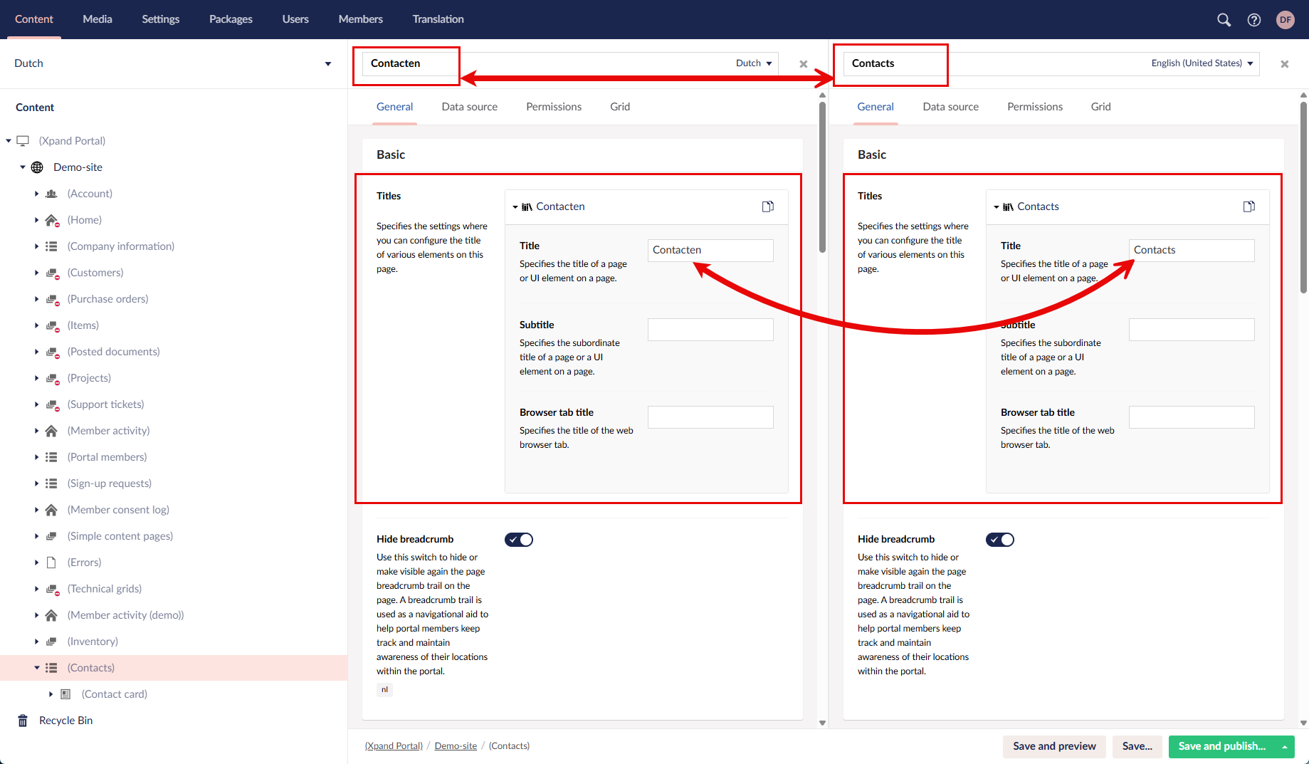 Site nodes as well as certain page settings are shared between localizations. This means that if you delete a page or page element in one localization, it will also be deleted in other localizations for the same portal site. If you change a shared setting, it will be changed in other languages as well. Hover over a setting to see if it is shared.