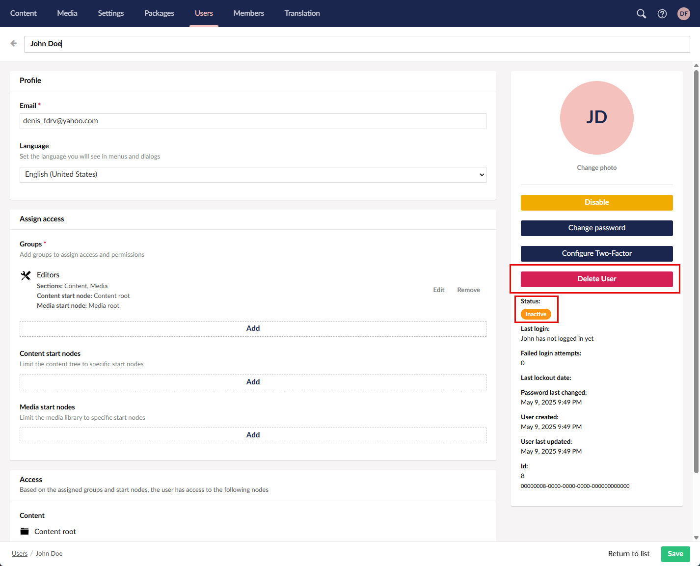 CMS administrators can perform various actions with CMS users. To manage a CMS user, sign in to CMS with an administrator account, go to Users and select the name of a user that you want to manage.