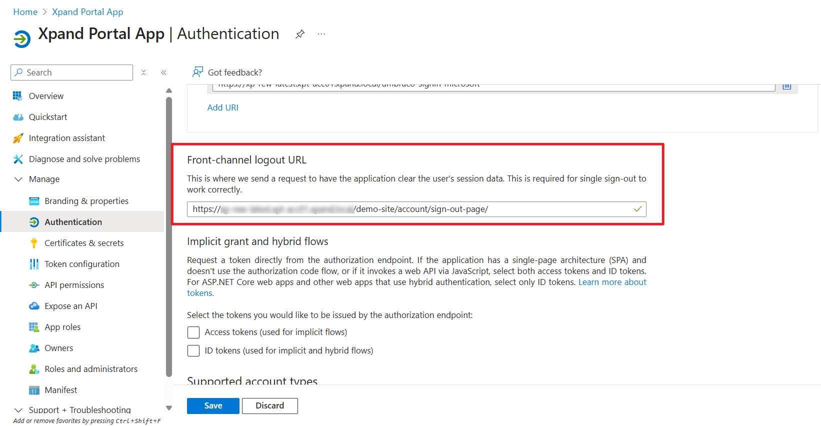 - In the Front-channel logout URL section, specify the logout page of your portal. For example, https://[your_portal_domain]/demo-site/account/sign-out-page/ where [your_portal_domain] is the domain where your Xpand Portal solution is deployed and /demo-site/account/sign-out-page/ is the path to the sign-out page on your portal (in portal settings, it is specified in the Account registration page settings, on the Related pages tab, in the Sigh-out page setting; the Sign-out page must be created and configured).