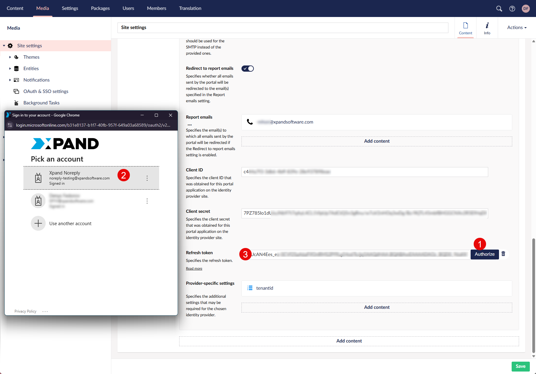 This setting is used when the Token issue method setting is set to Authorization code. To get a refresh token from the identity provider, after you have set up the Client ID, Client secret and (in case of Microsoft Entra ID), the Tenant ID settings, select the Authorize action and authorize a Microsoft/Google account with the corresponding identity provider. The account must have the appropriate permissions to send emails. Once you sign in, follow the instructions on screen and, if asked, grant permissions that the identity provider requests. As a result, the refresh token is issued by the identity provider and automatically filled in this setting.