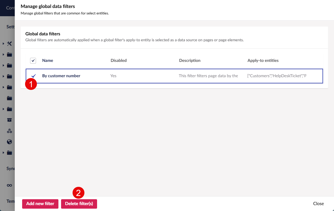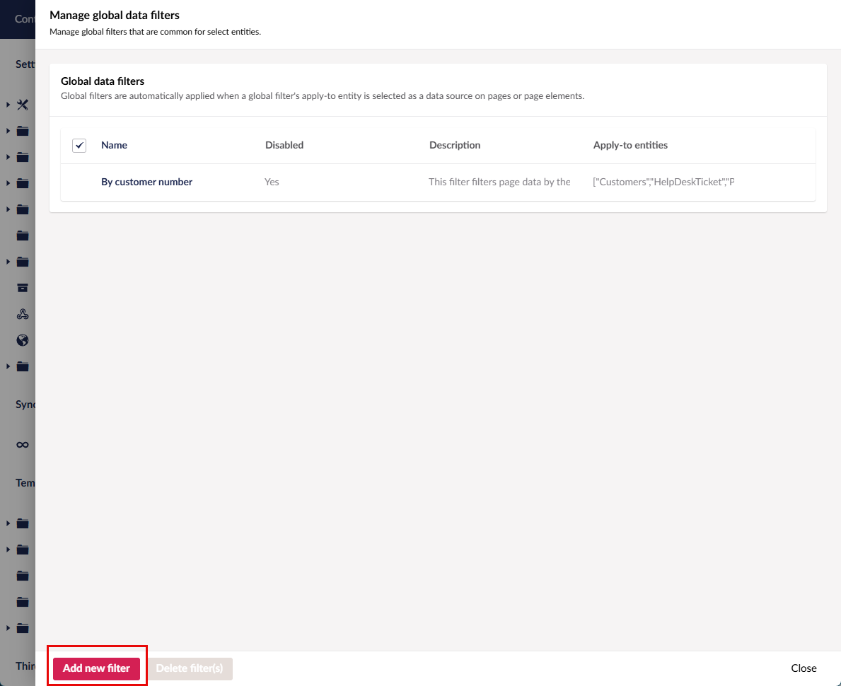 Global filters simplify this process by allowing you to define important filters once and apply them automatically across all relevant pages. When a data source entity with global filters assigned is selected for a page, those filters are automatically added, ensuring consistent access control and reducing configuration effort.