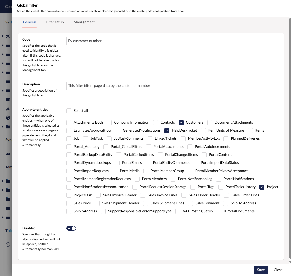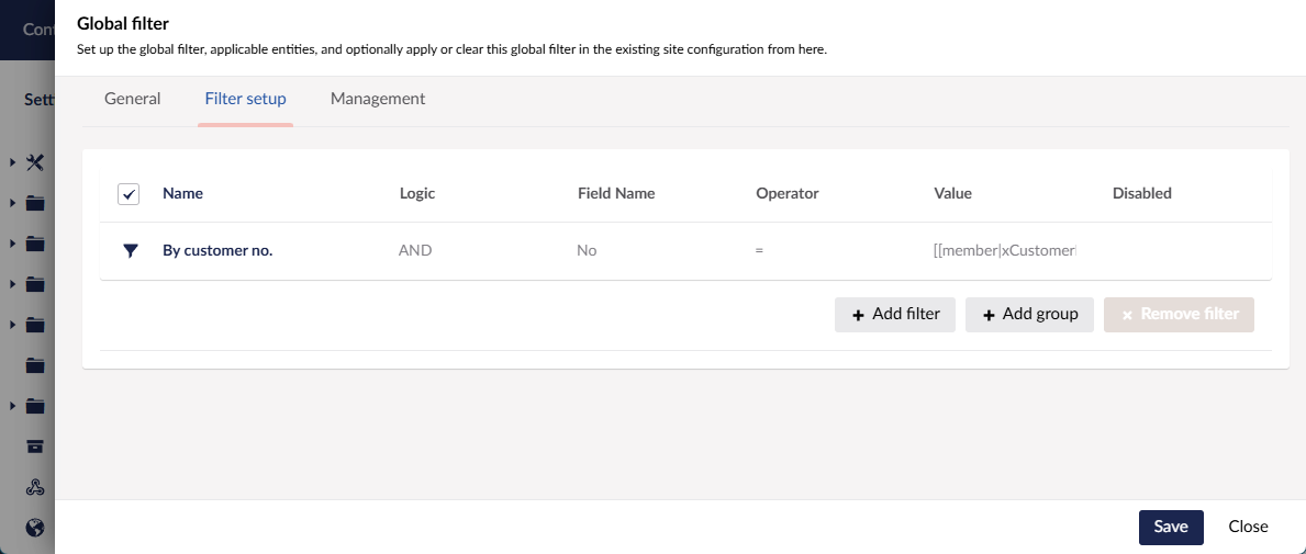 - On the Management tab, you can manage this global filter in the existing portal configuration: you can apply or clear the filter in the site nodes of your choice.