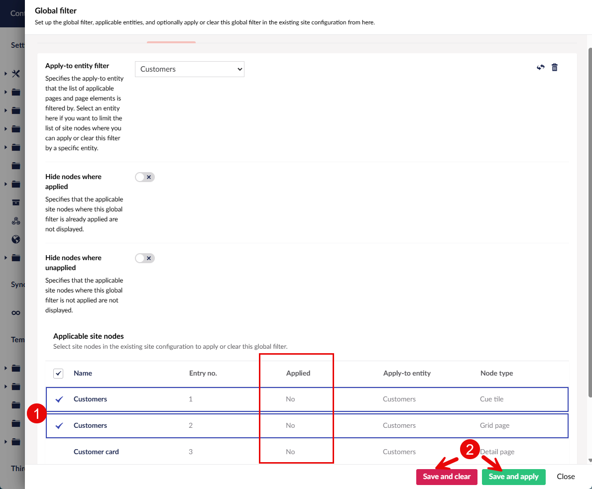- Save and clear - Save the changes and clear this global filters on the selected site nodes if possible.