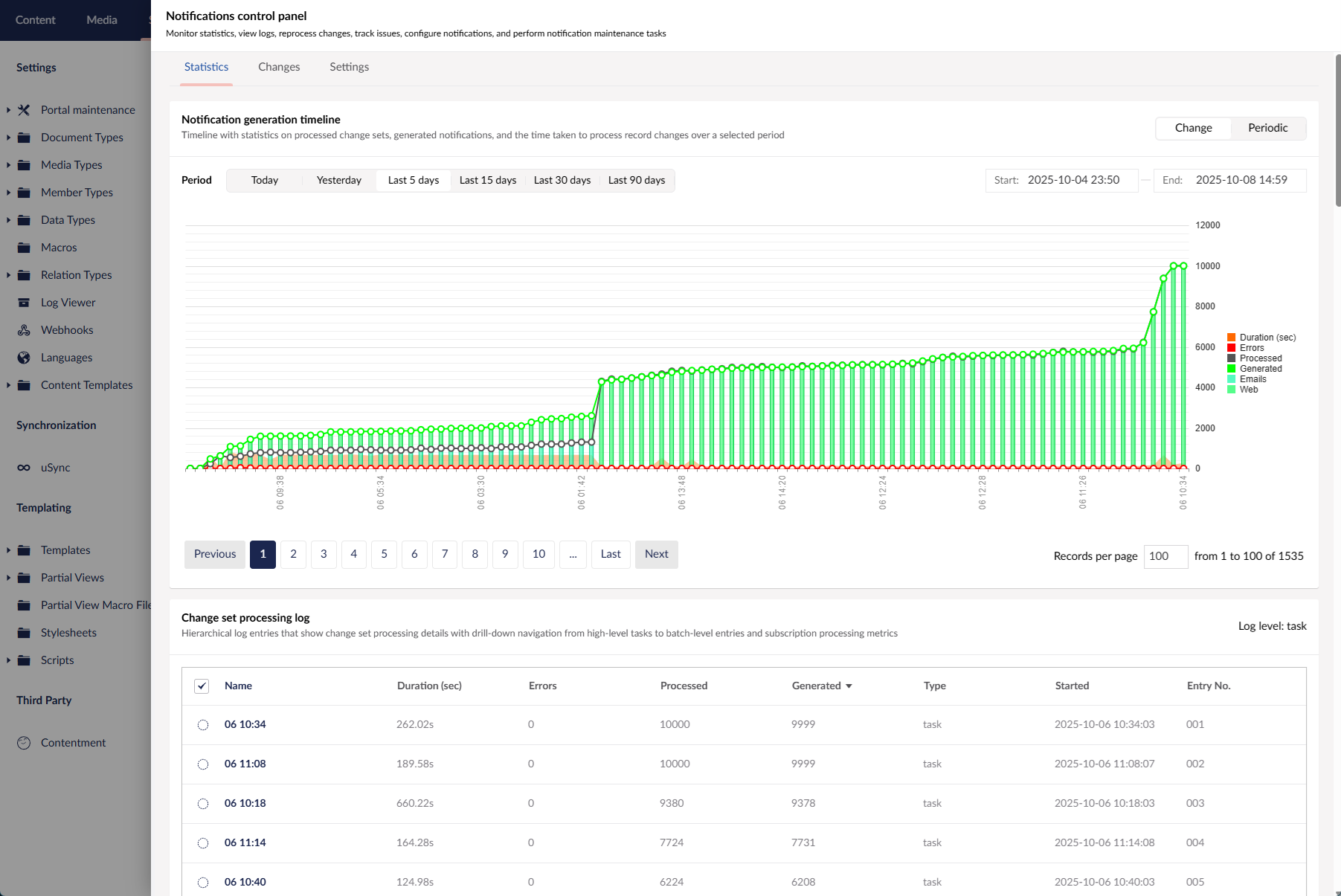With this panel, you can track notification statistics over time, review processing details at various levels (from background tasks down to individual subscriptions), and identify issues that may affect notification delivery. Additionally, portal administrators are automatically alerted by email when notification-generation issues occur, ensuring that problems are detected and resolved promptly.