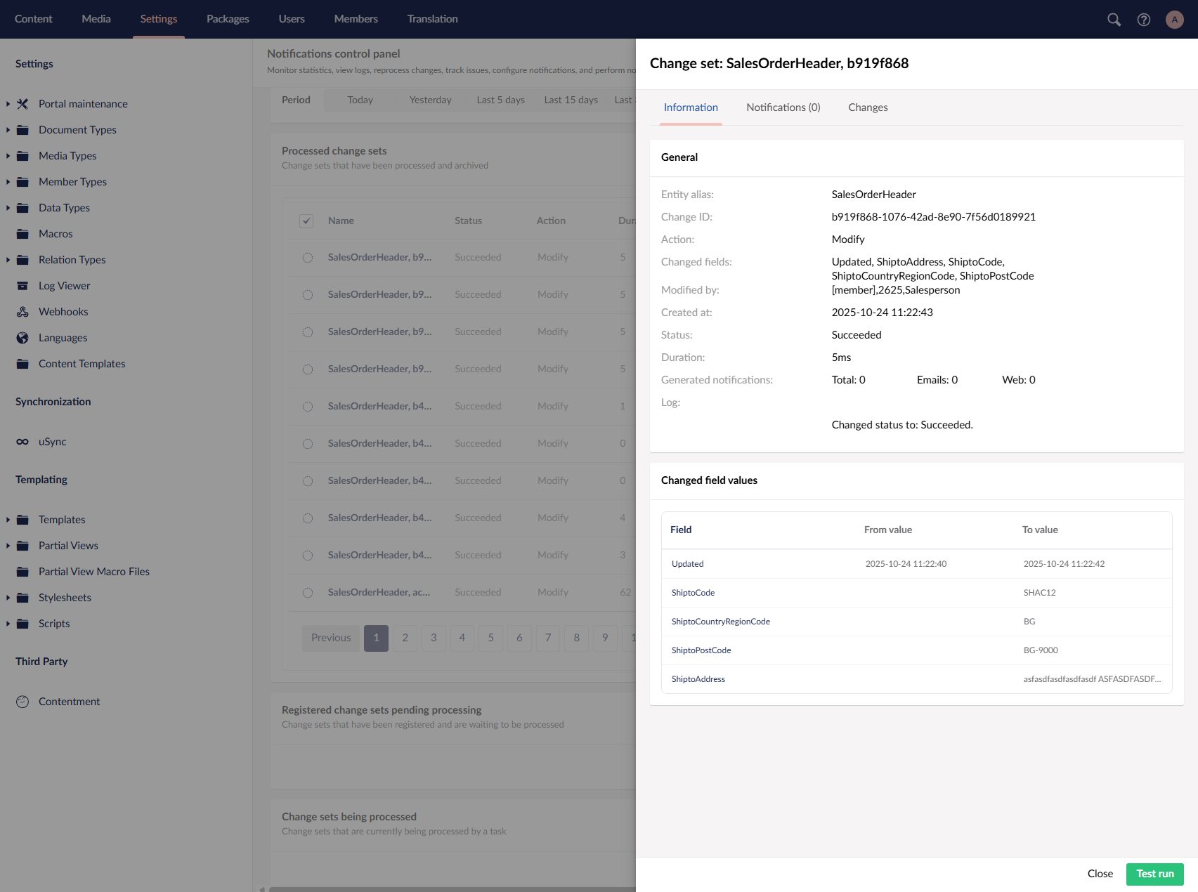 - Information - Shows the general information about the change set. The Changed field values section shows the updated field values in this change set.