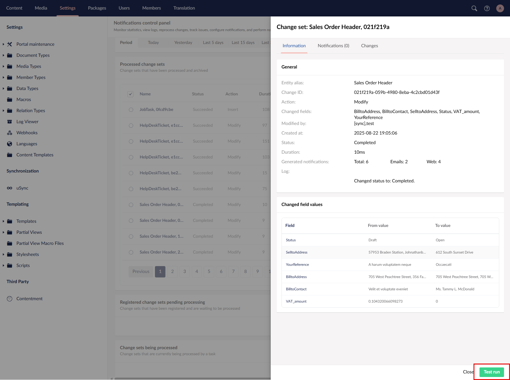 - Information - Shows the general information about the processed change set and this test run. The Changed field values pane shows the changes in field values in this simulation.