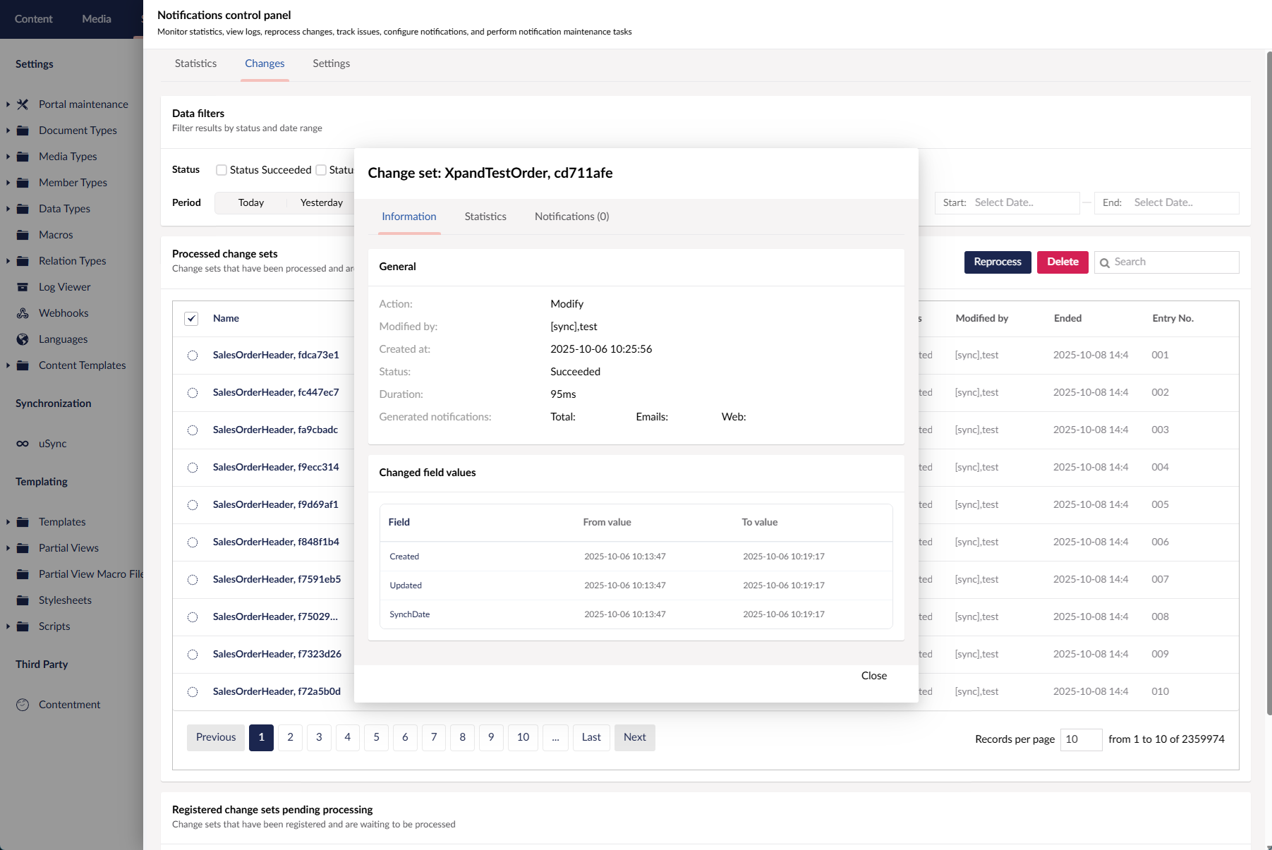 The Notifications Control Panel provides administrators with powerful tools to monitor, analyze, and troubleshoot notifications in Xpand Portal. It offers an overview of notification activity, detailed logs for background tasks, and options to test or reprocess change sets — all in one place.