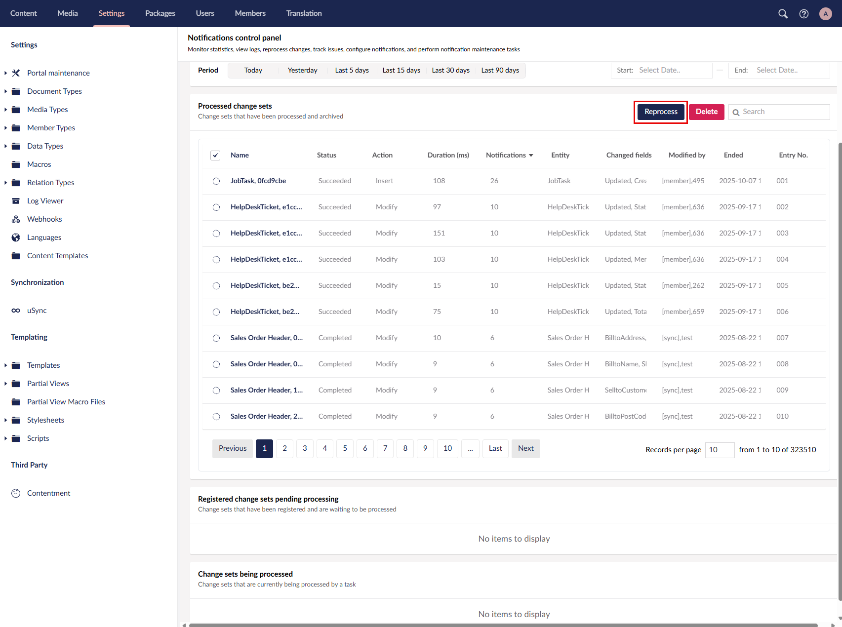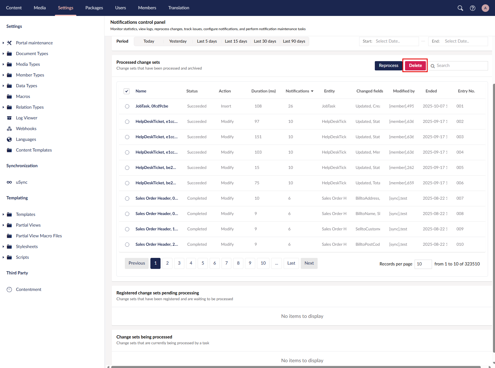 In the Processed change sets log, you can select an entry(ies), and then select Delete to delete the processed change set log entries. The Notifications Control Panel can also be configured on the Settings tab to clear log entries automatically.