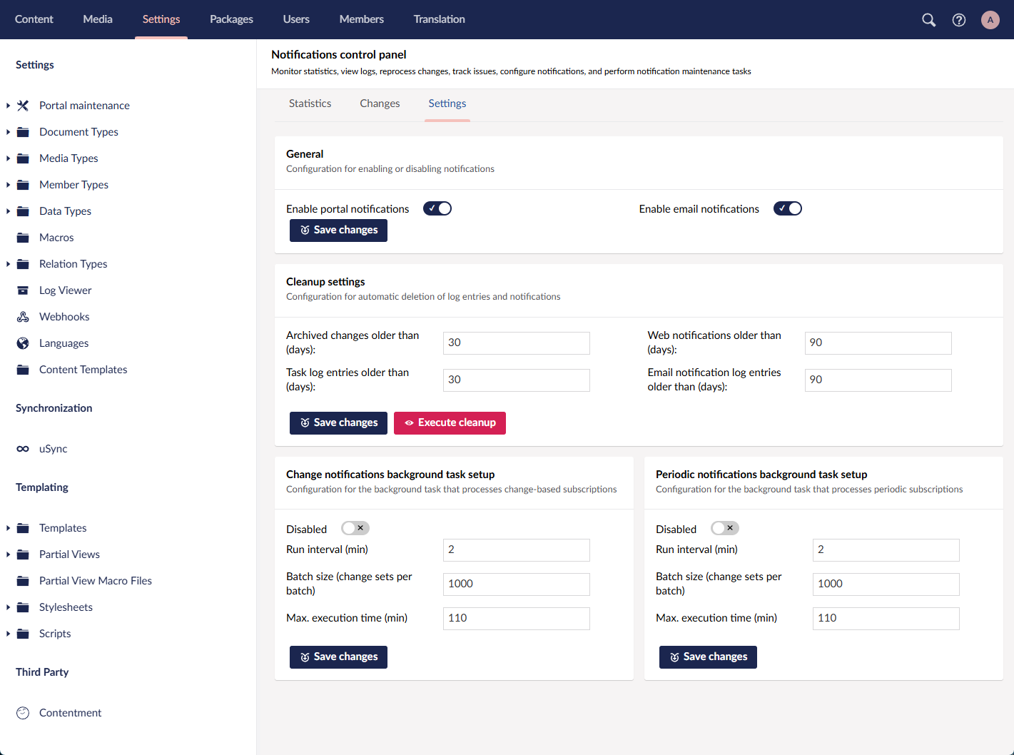 - Cleanup settings - Configure automatic deletion of generated notifications and log entries in the Notifications Control Panel: