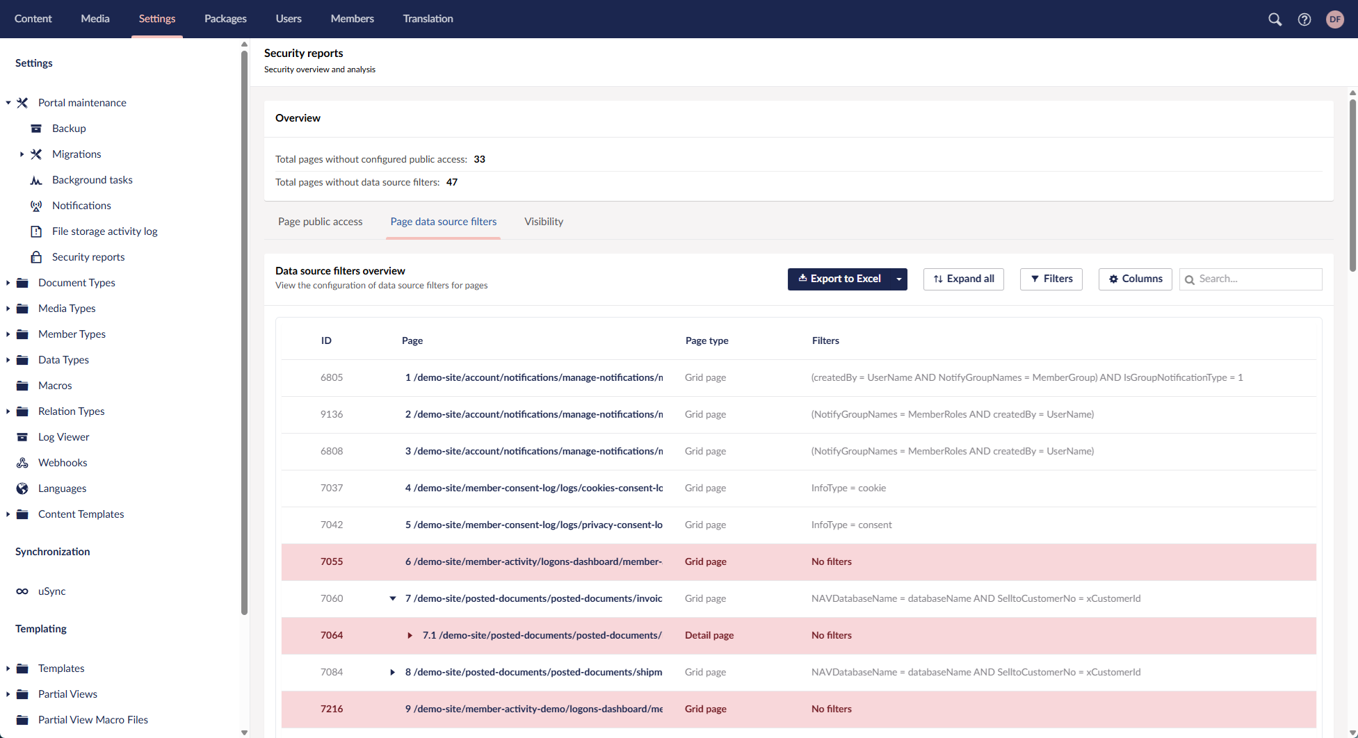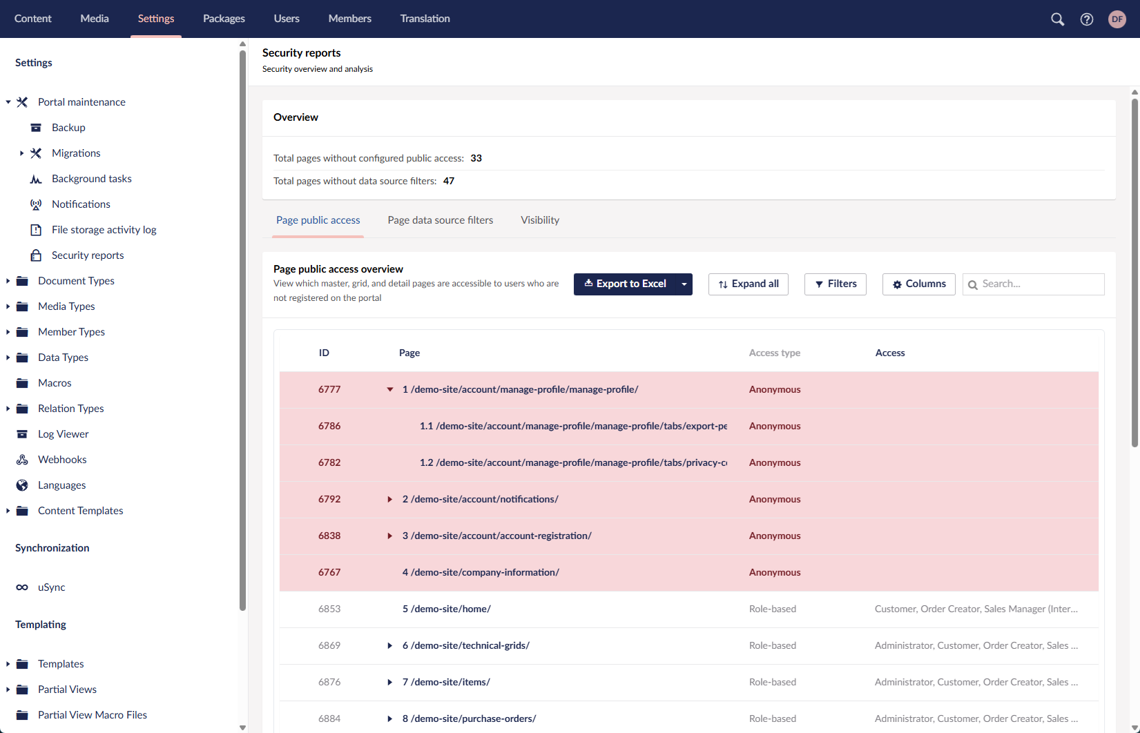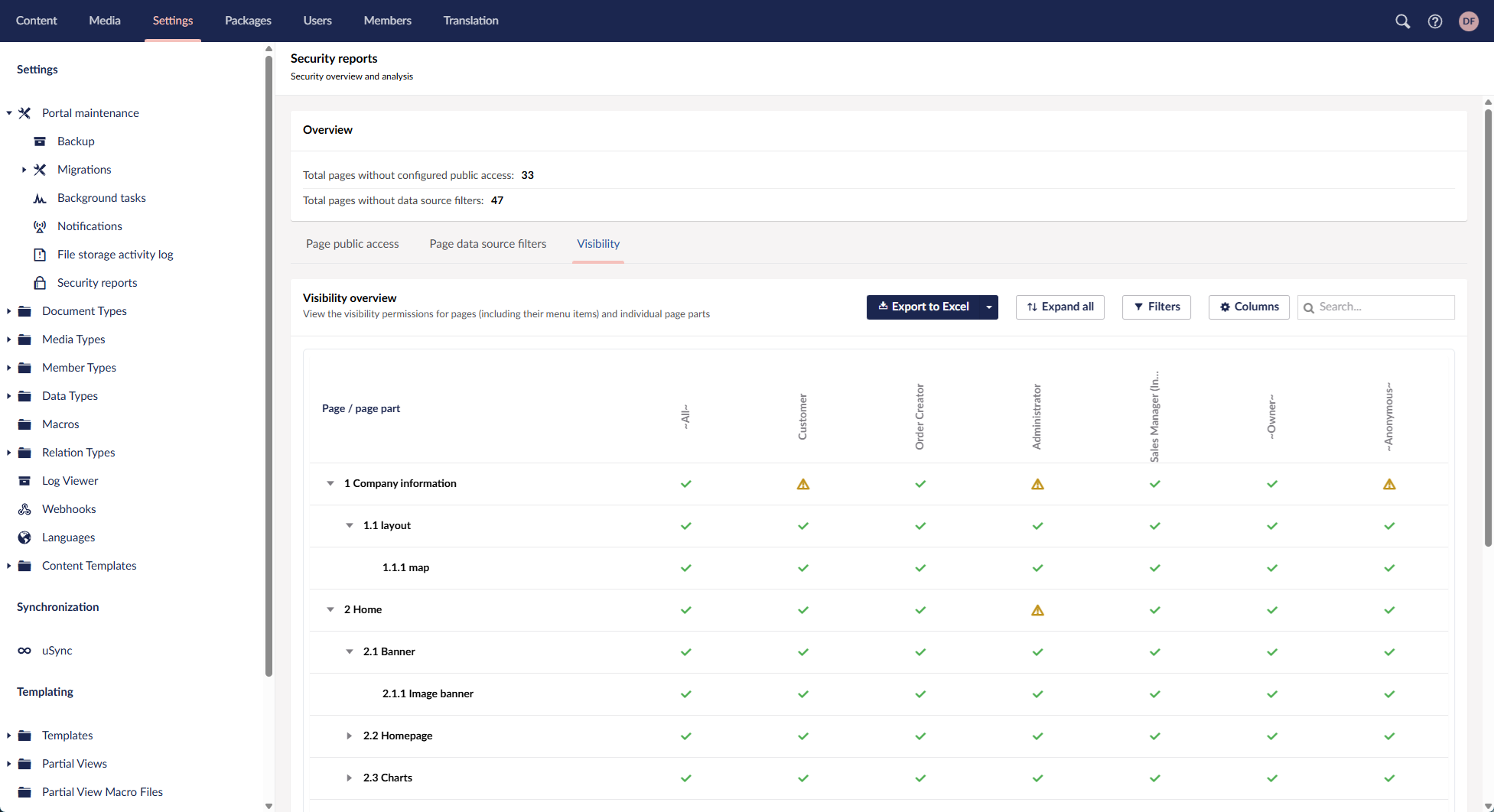 Across all security reports, you can export data to Excel, expand or collapse nodes, and customize the view using filters, column visibility, and column width. Selecting a page or page part takes you directly to the corresponding settings page, where you can adjust the related security configuration if necessary.