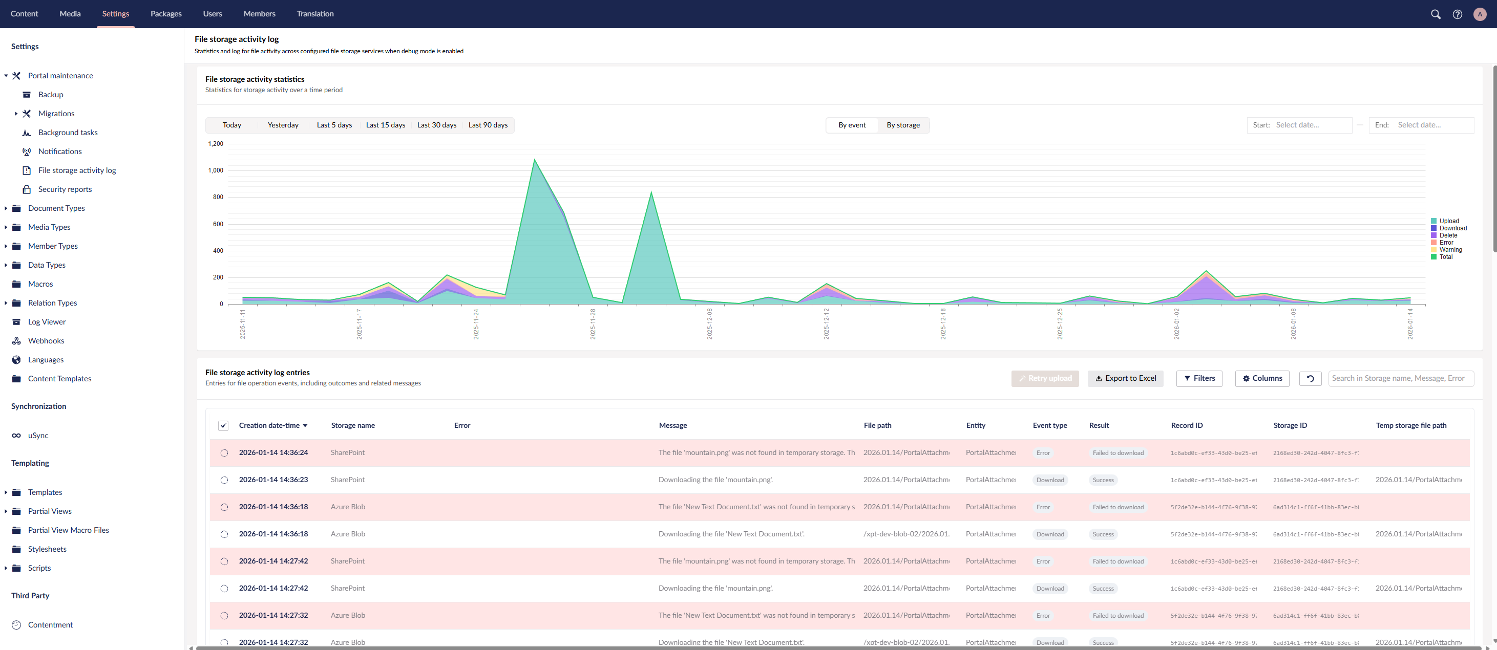 Integration with file storage services includes a File storage activity log that provides visibility into file storage operations across all configured storage services. When the debug mode is enabled, the log captures statistics and registers detailed entries for file-related events.
