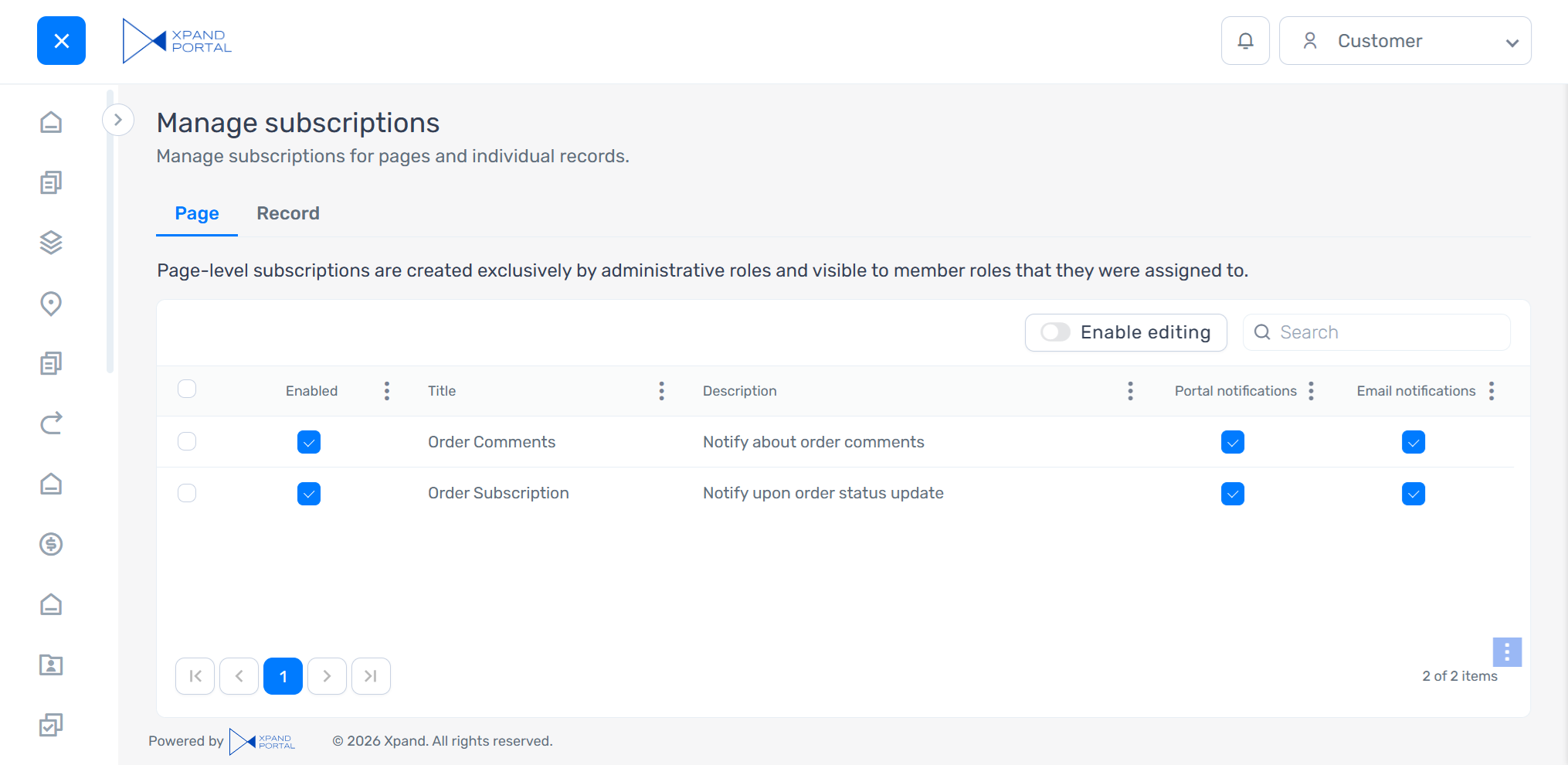 Members with this role can view both page-level and record-level subscriptions and have extended permissions to create and edit page-level subscriptions. This role is designed for scenarios where certain members need to manage page-level subscriptions, which are assigned to member roles, without having full administrative access.