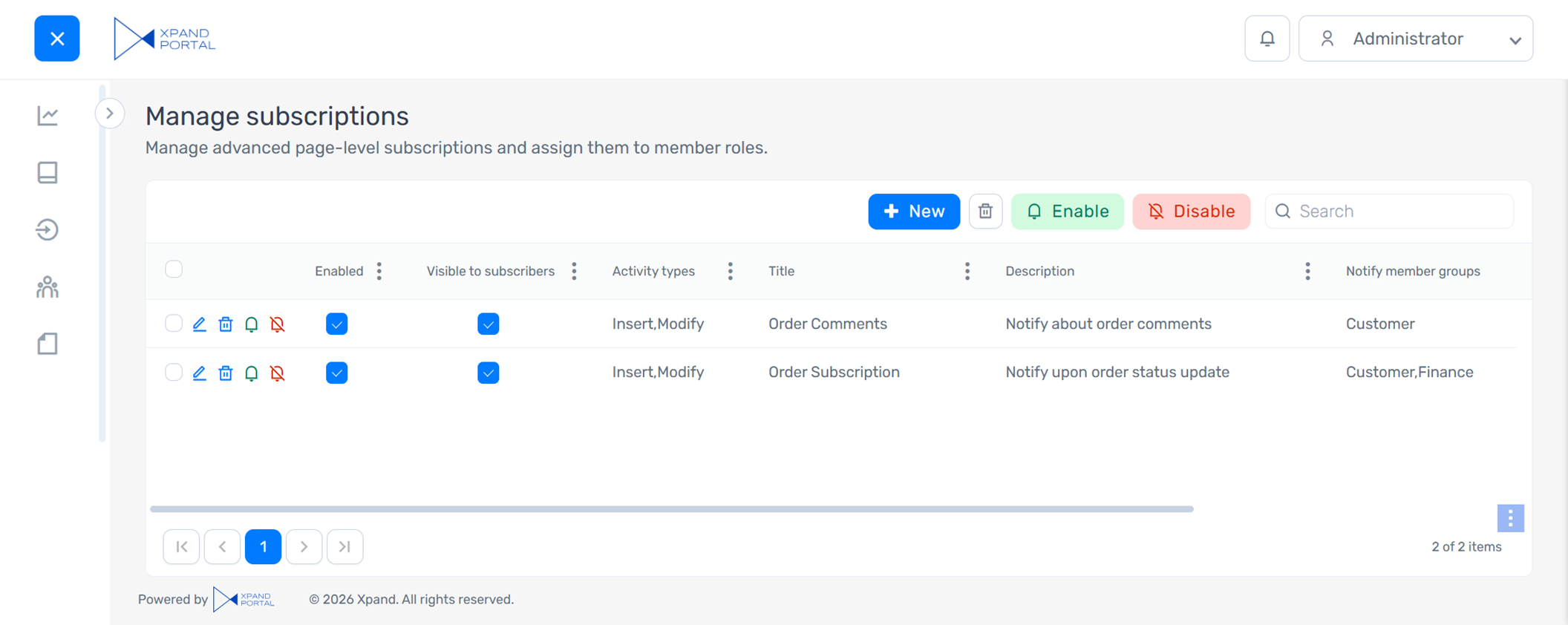 - The Title and Description columns are now automatically populated using the pattern configured for the Notifications action on the portal page where the subscription was created. For this, two new action settings, Subscription title and Subscription description, were added. These settings support variables, allowing subscription titles and descriptions to be context-specific and easier for members to understand.