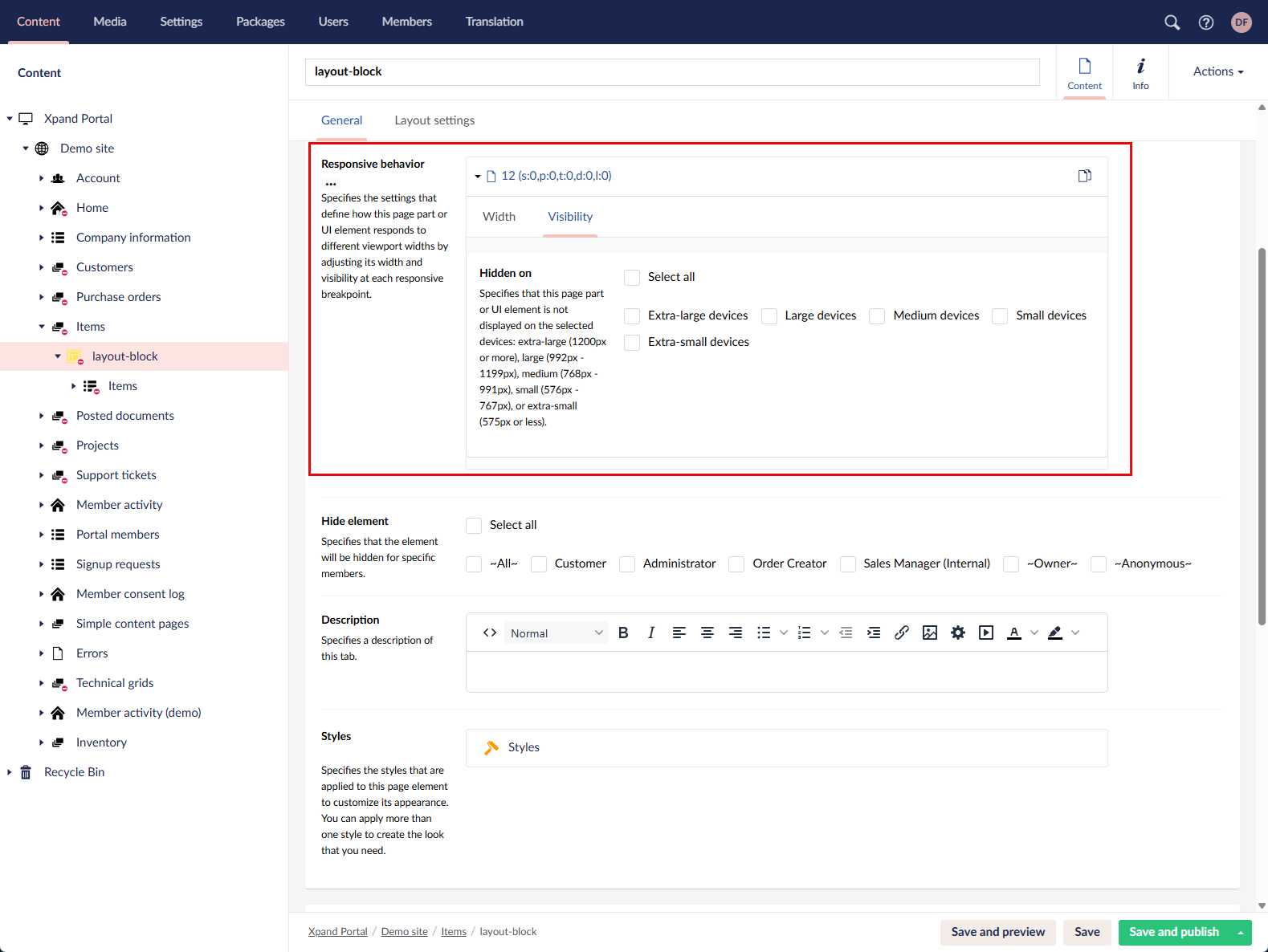We revised and expanded the responsive behavior settings. Previously, you could configure only the relative width of a UI element for different devices (viewports). You can now also control element visibility by hiding it for specific viewport widths.