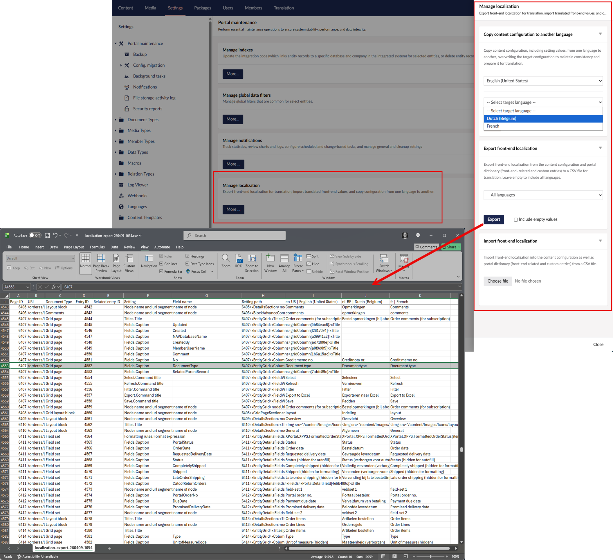 Copy the full site configuration from one language to another, overwriting the target configuration, including setting values. This allows you to quickly align languages and use the copied setup as a consistent basis for translation. - Export front-end localization to CSV and import translated values back into the portal